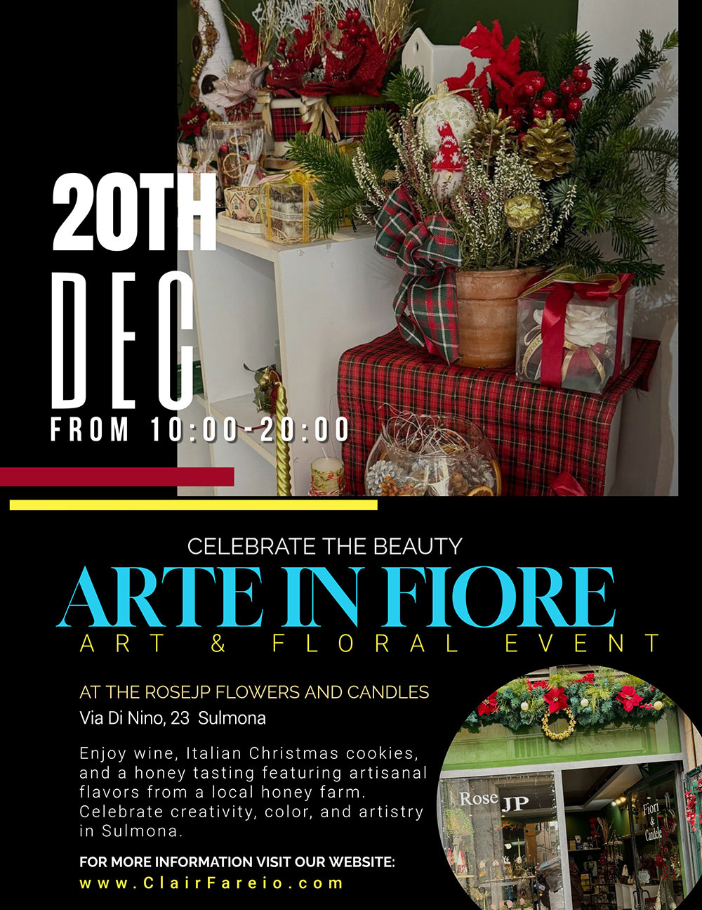 Guests can enjoy wine, traditional Italian Christmas cookies, and a honey tasting featuring multiple artisanal flavors from a local honey farm. Gallery-style displays throughout the shop invite visitors to explore the interplay between art and flowers. This event is perfect for art lovers, flower enthusiasts, and anyone seeking a festive, creative experience in the heart of Sulmona.