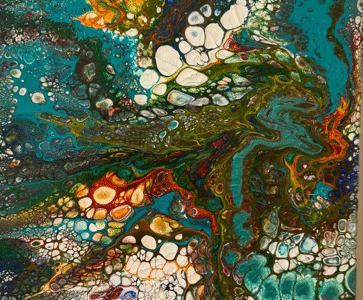 In Fractured Currents, flowing rivers of color collide and diverge, capturing the tension between movement and stillness. Vibrant teals, fiery oranges, and deep greens surge across the canvas like shifting tides, while intricate cellular patterns emerge from the chaos — echoes of nature’s hidden geometry. The piece invites viewers to lose themselves in the push and pull of energy, where fragmentation gives rise to unexpected harmony.