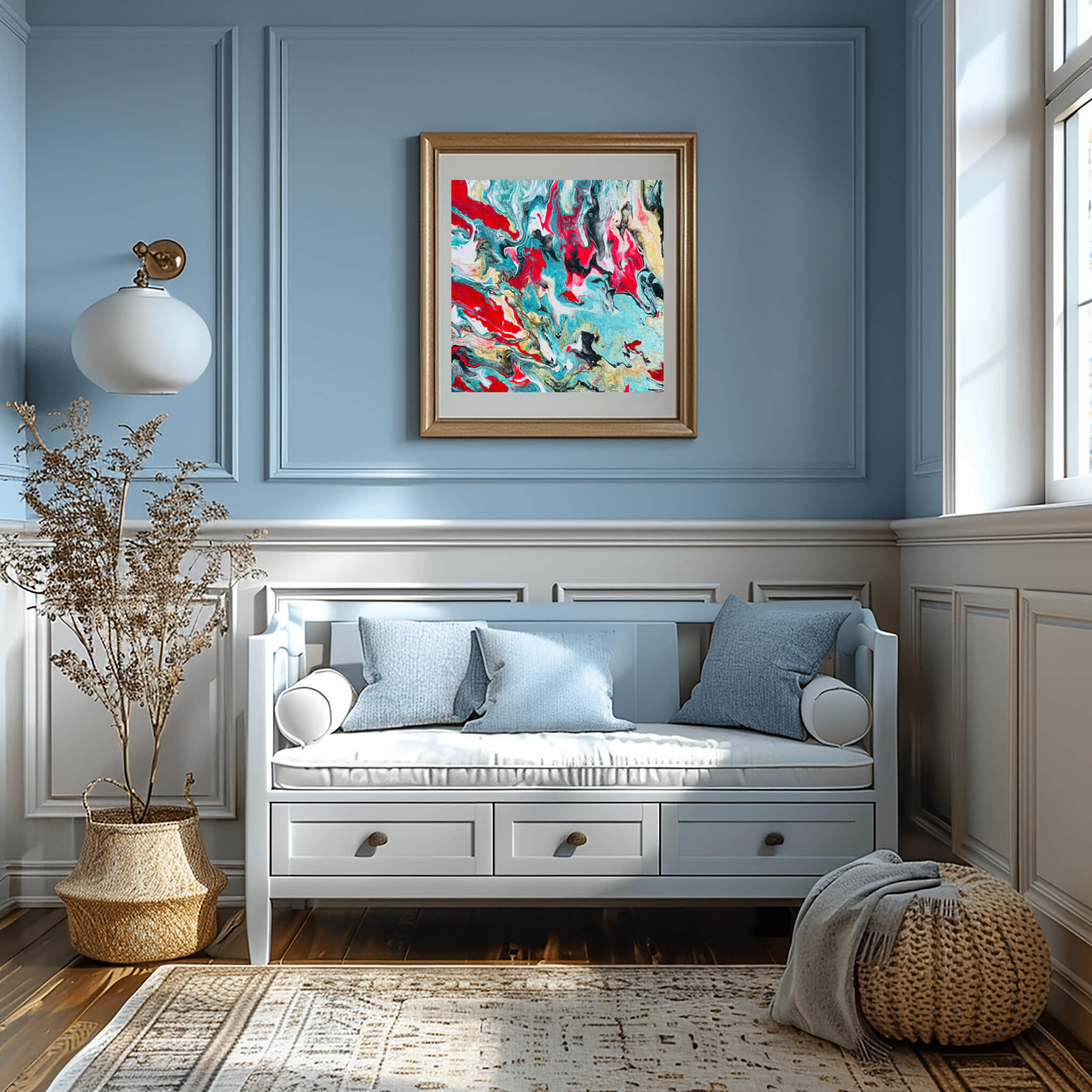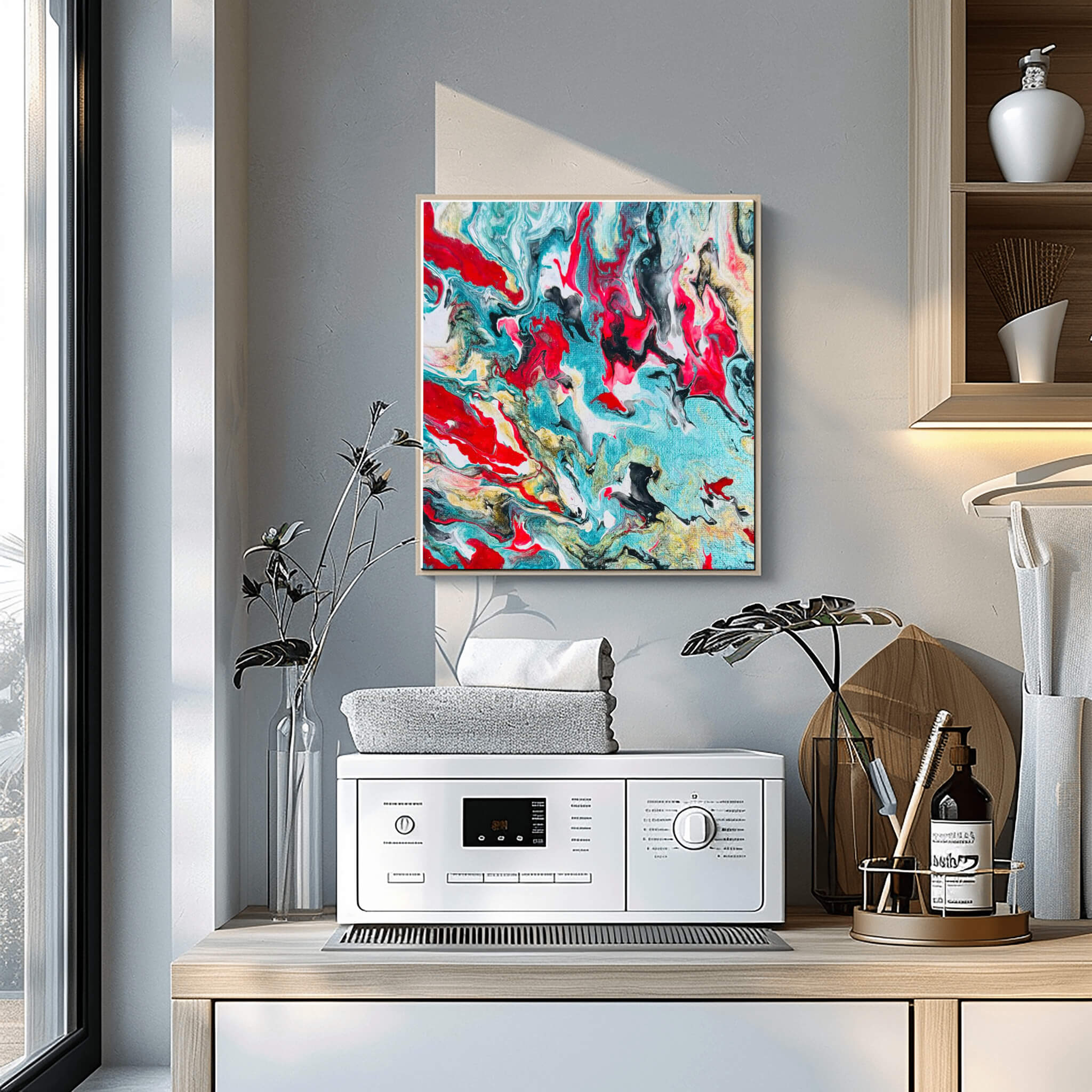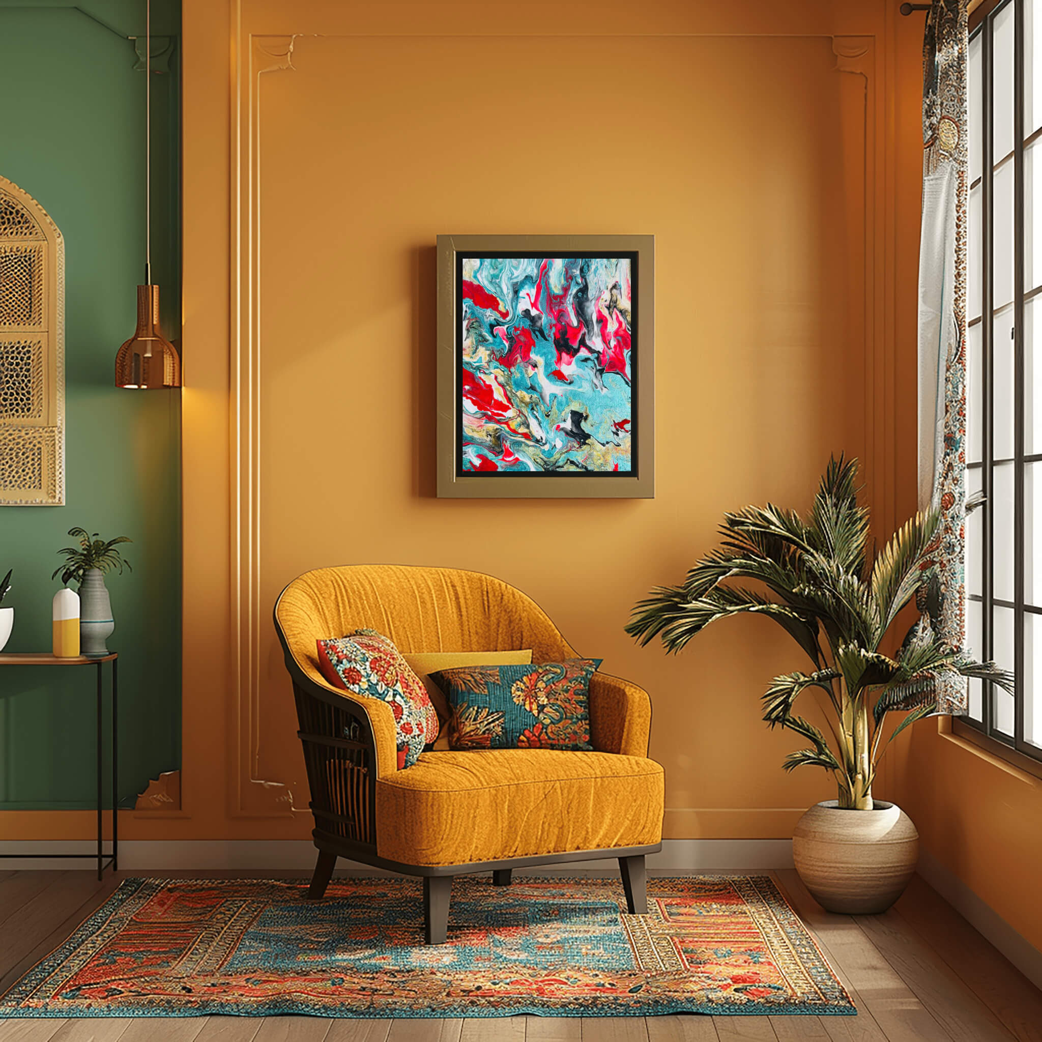 Aurora Mirage unfolds like a celestial storm in motion, where ribbons of turquoise, gold, and scarlet cascade across a luminous expanse. Each movement of paint reflects the dance of light through shifting air—a fusion of energy and calm suspended in radiant balance.
