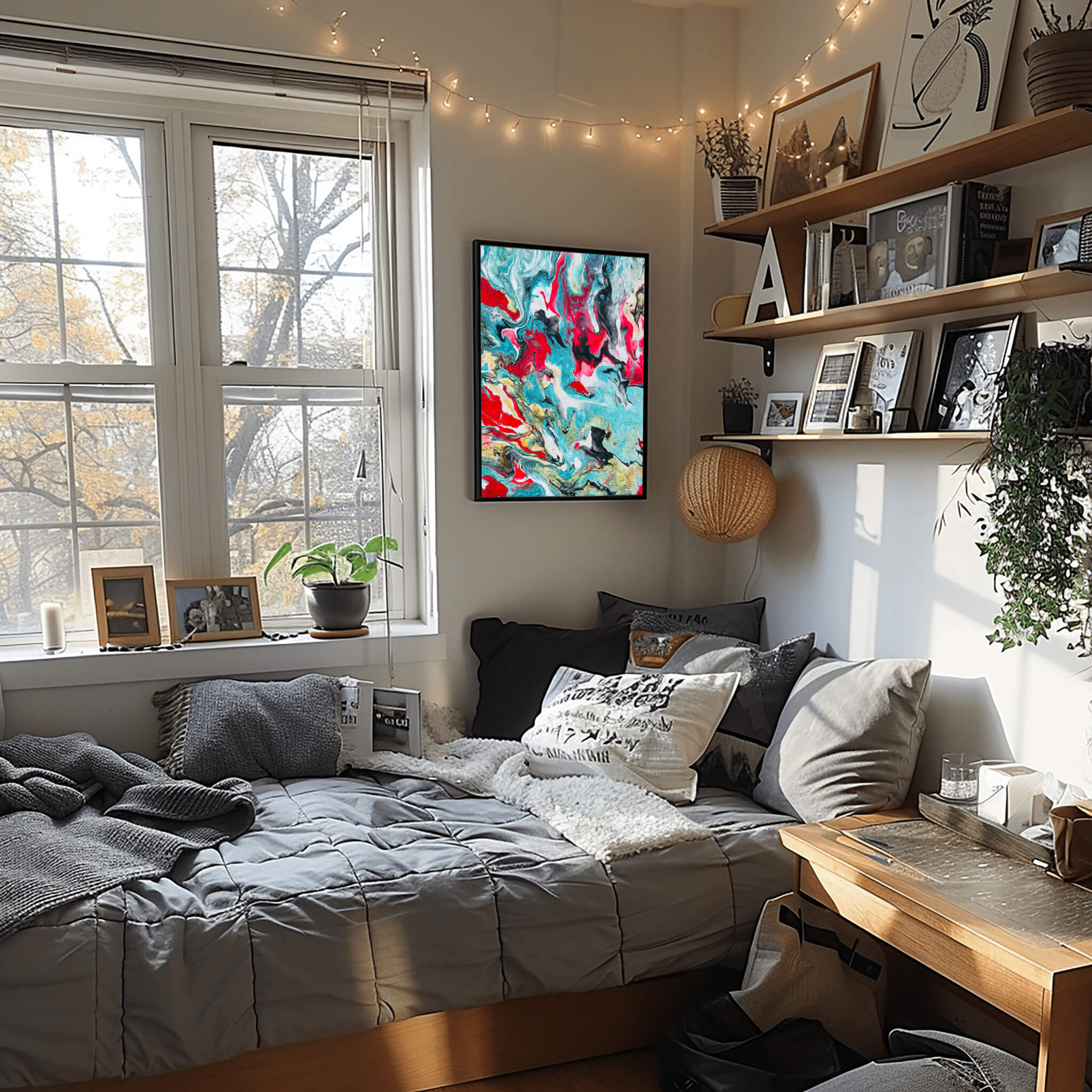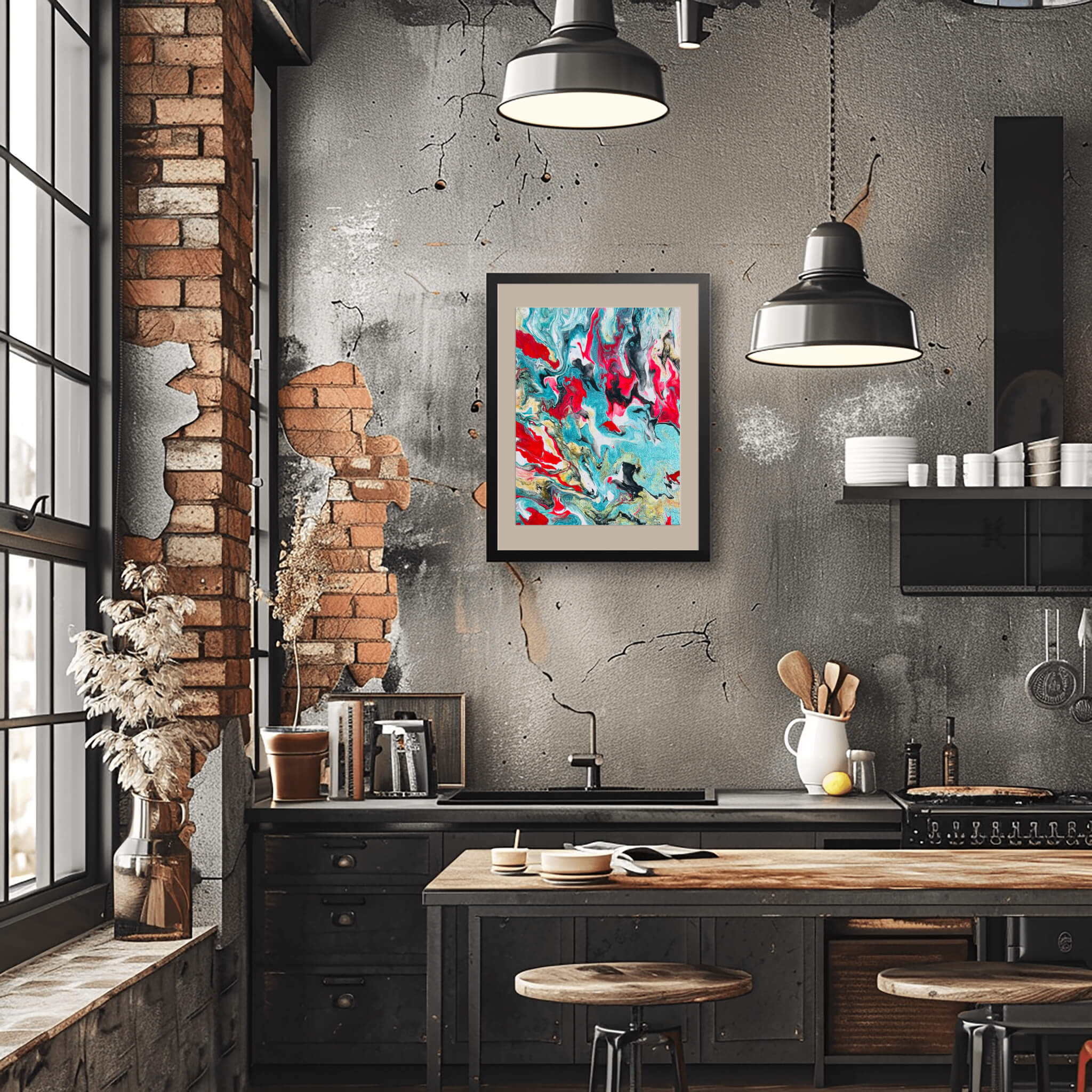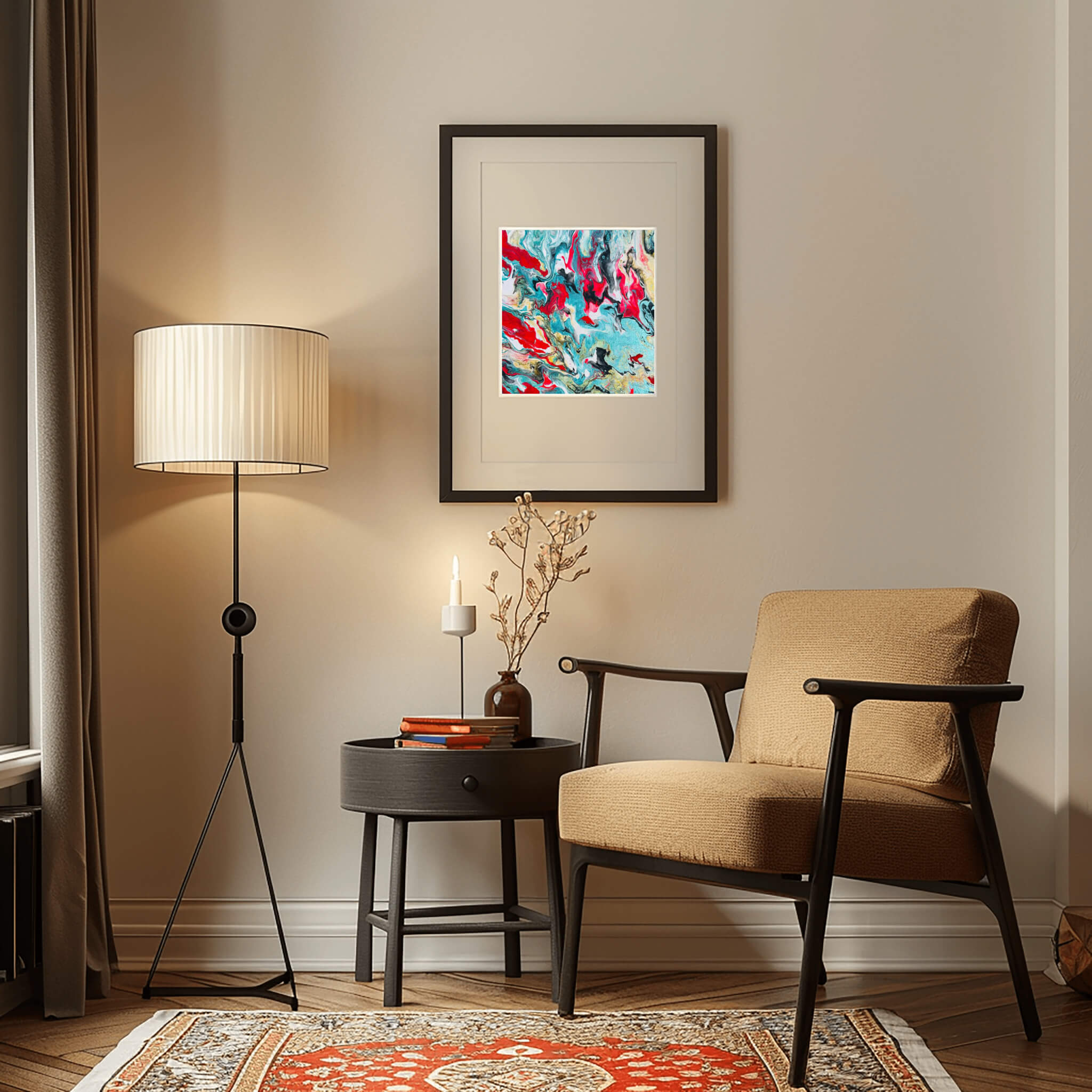 Aurora Mirage unfolds like a celestial storm in motion, where ribbons of turquoise, gold, and scarlet cascade across a luminous expanse. Each movement of paint reflects the dance of light through shifting air—a fusion of energy and calm suspended in radiant balance.