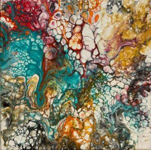 • Abstract acrylic painting featuring layered turquoise, gold, crimson, and earth tones flowing across a textured surface that evokes a quiet, fluid landscape.