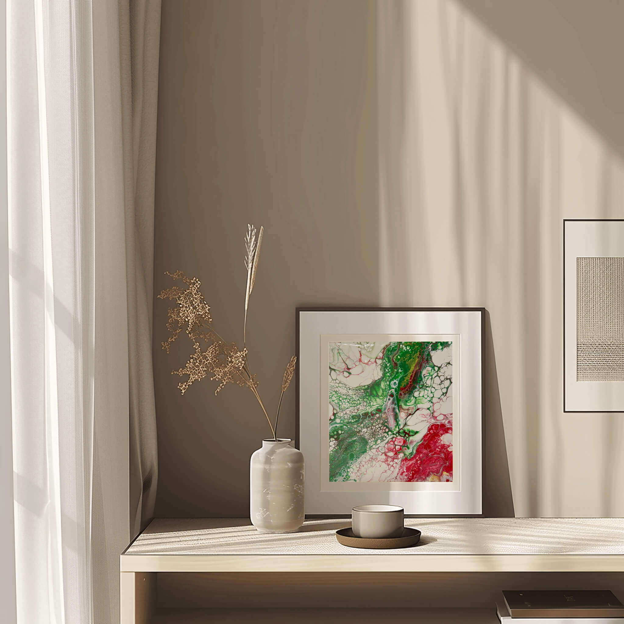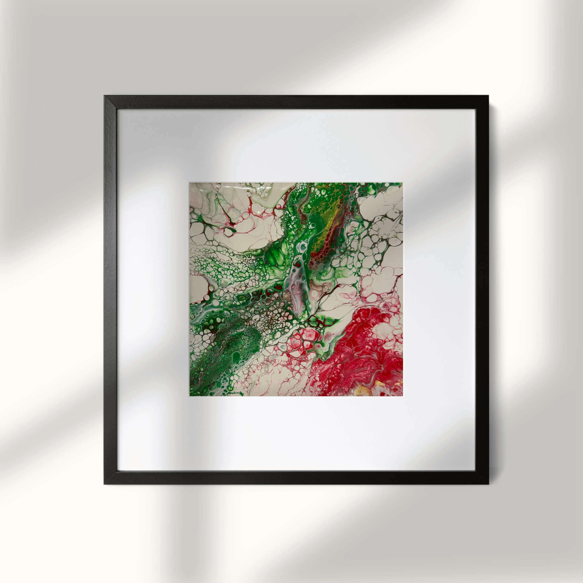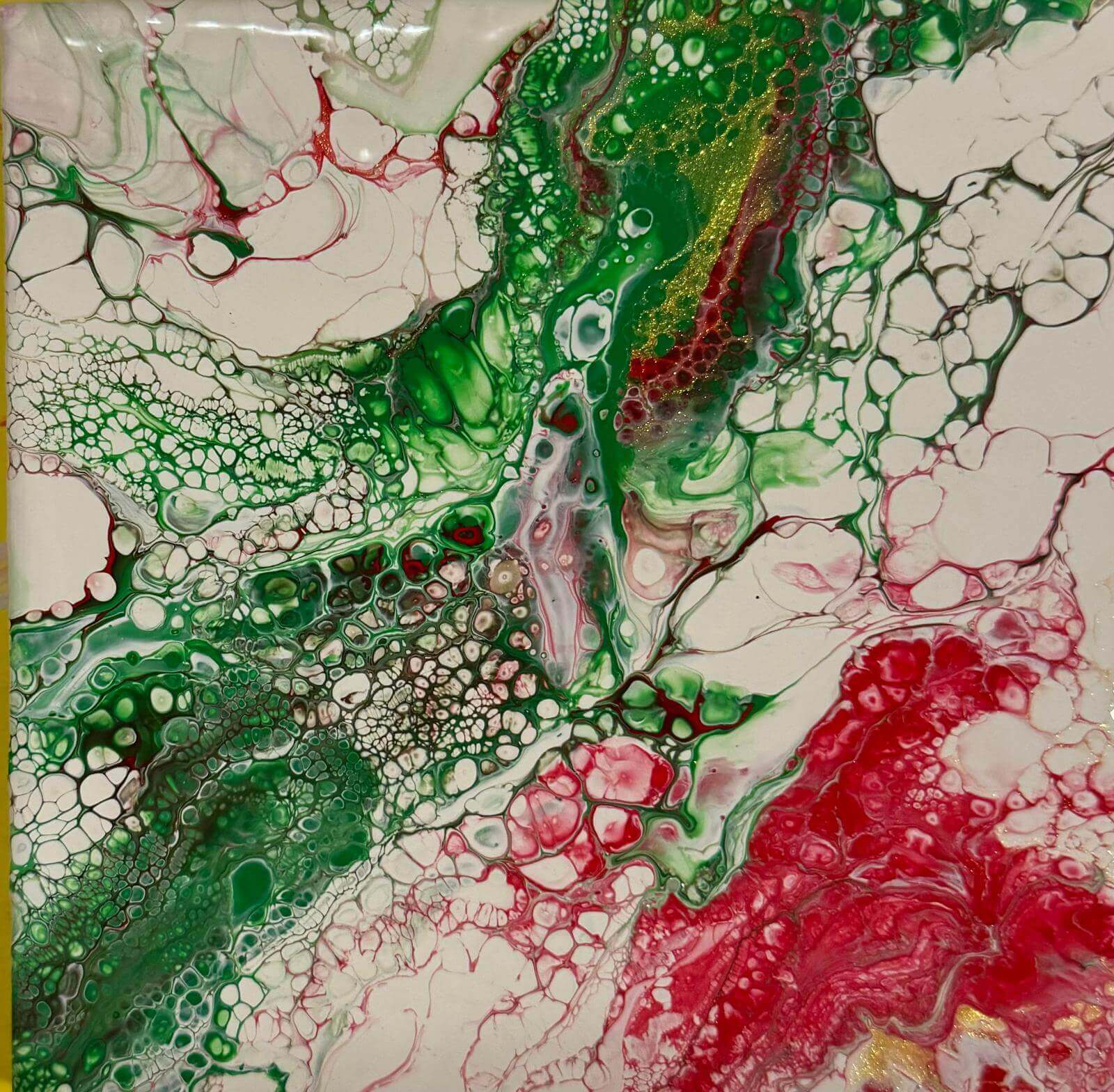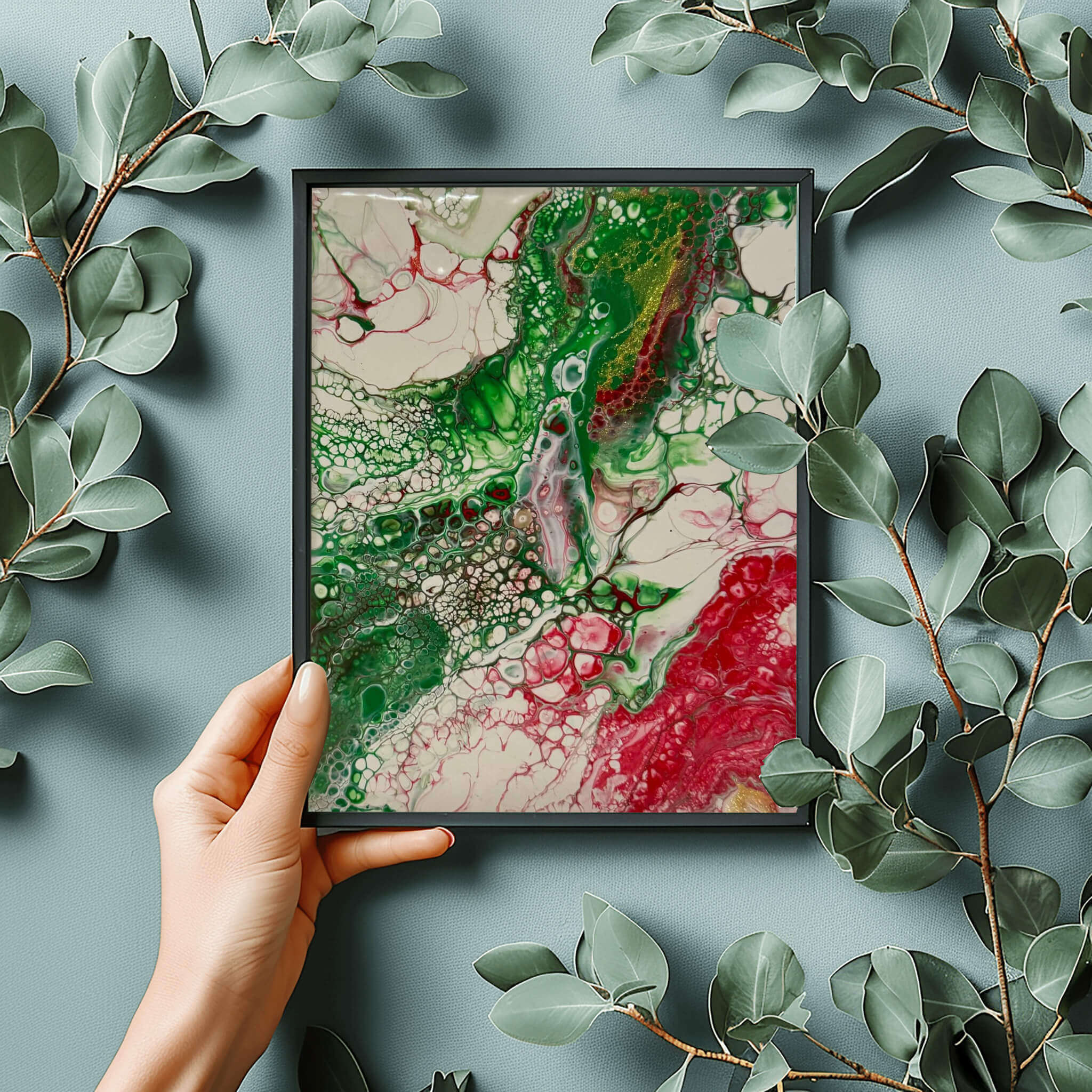 • Abstract acrylic painting with emerald rivers and crimson veins flowing through layered textures, resembling explosive organic growth in motion.