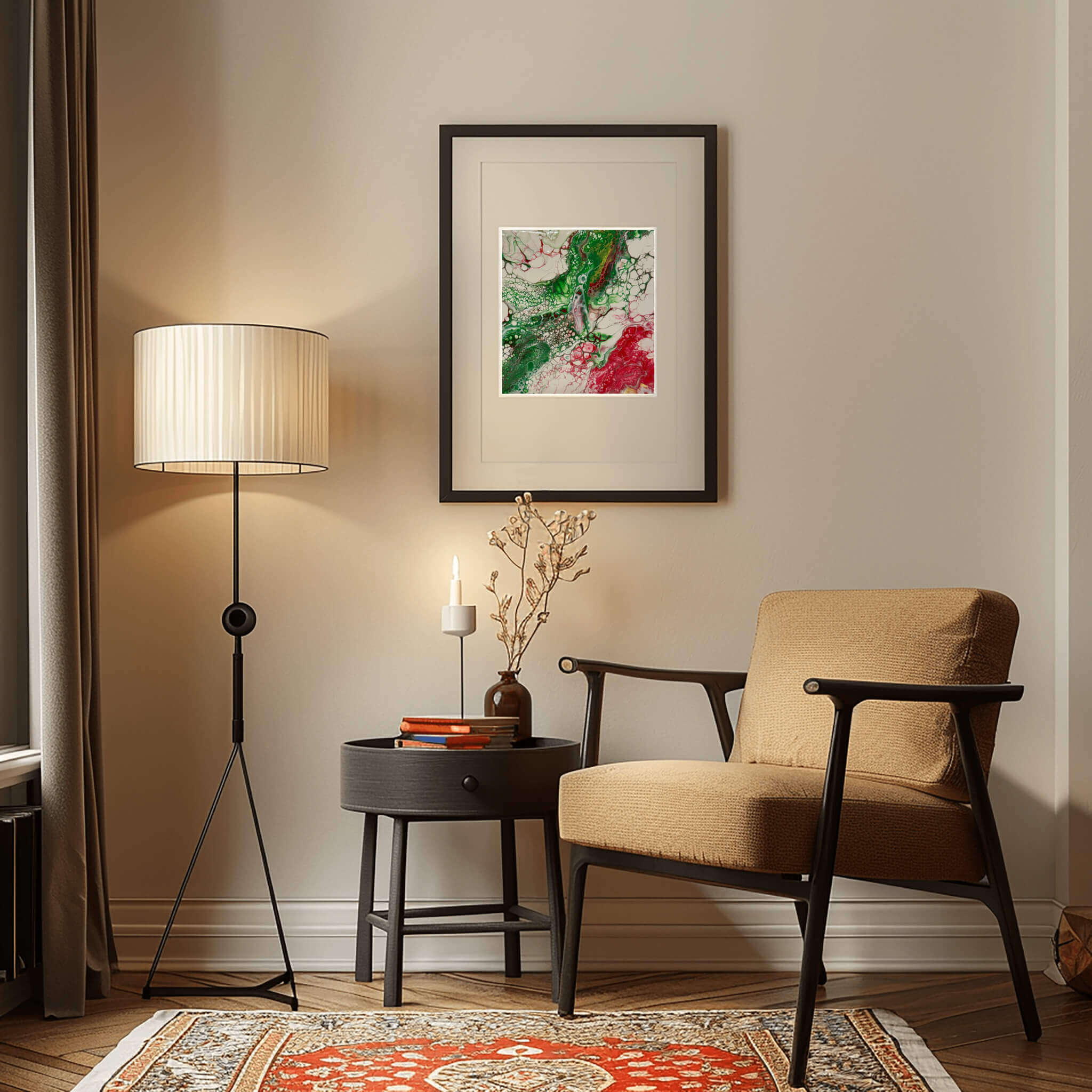 Holiday Cheer radiates a cozy glow of the season. A joyful burst of color and light, this piece captures the heart of the holidays, twinkling with warmth, a canvas wrapped in joy. Like a festive melody in visual form, this painting radiates merriment through rich red, evergreen hues, and golden highlights, inviting you to step into a world where every moment feels like celebration. Truly the spirit of the holidays.