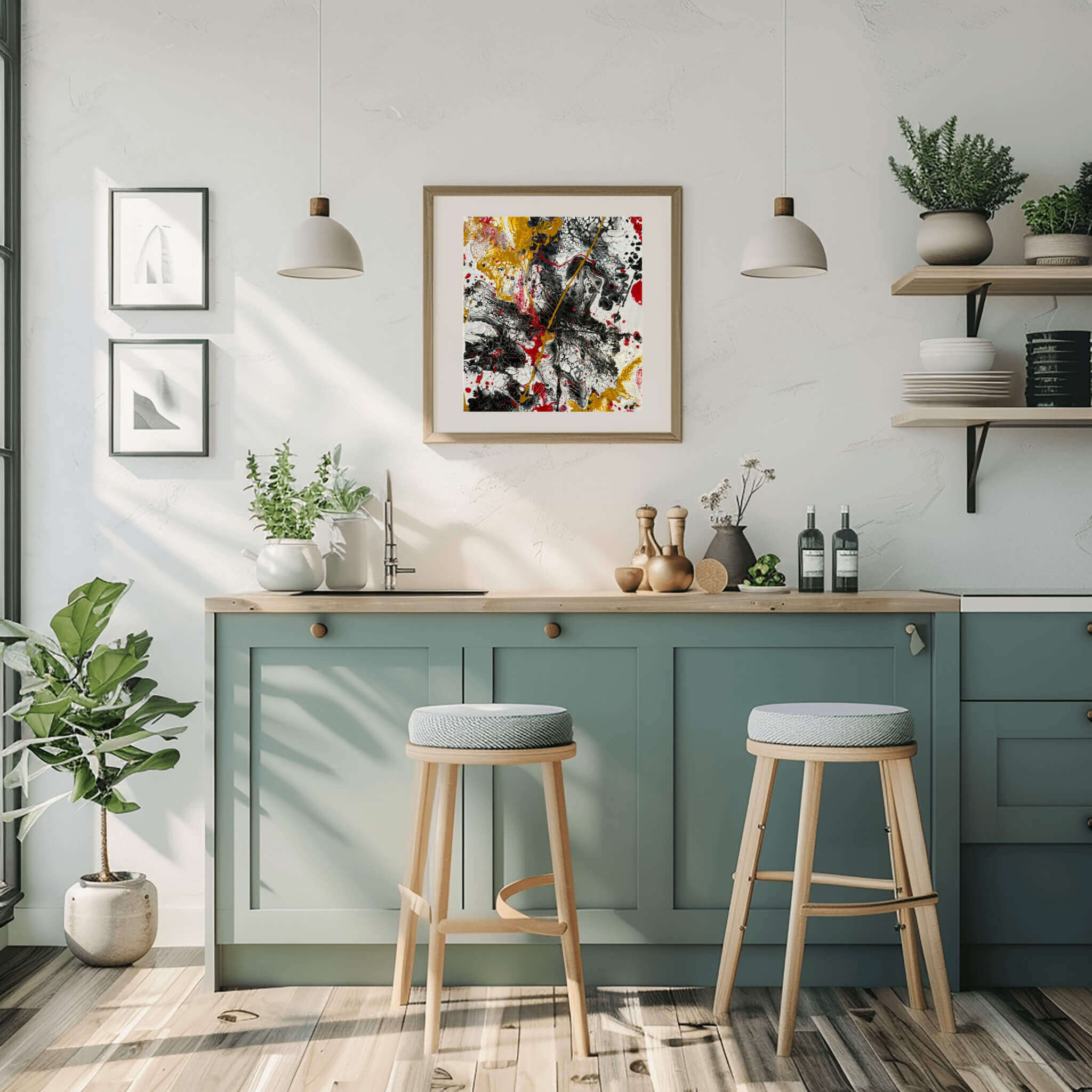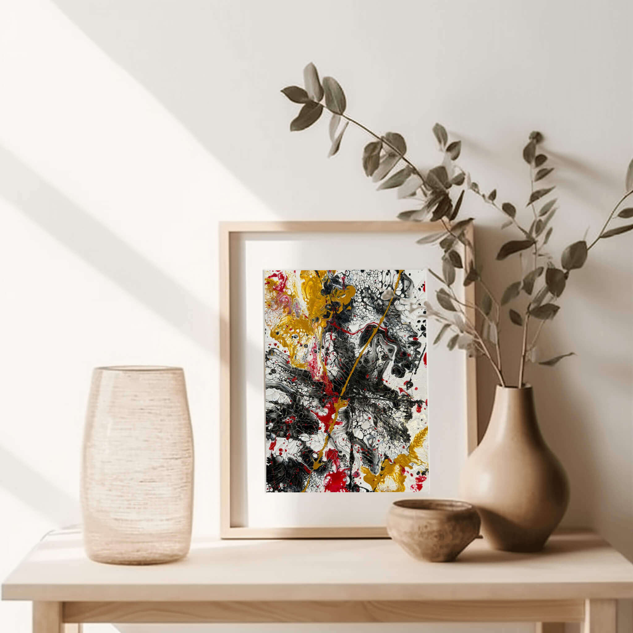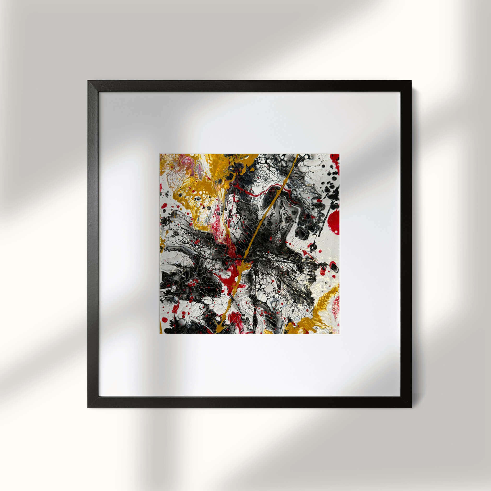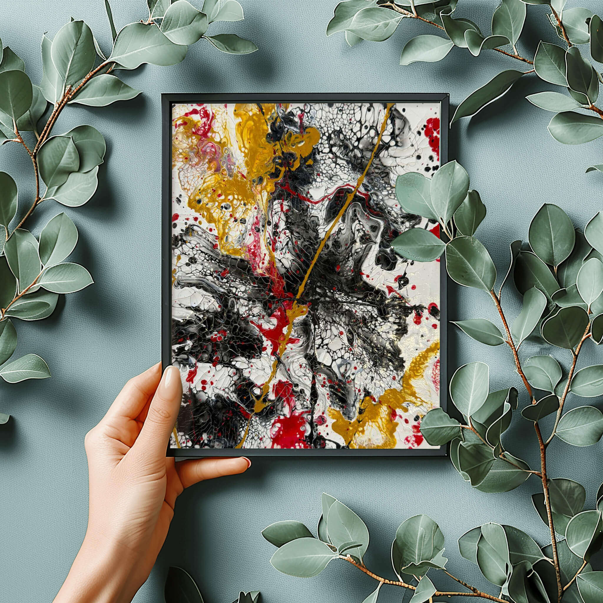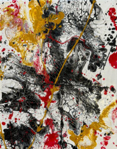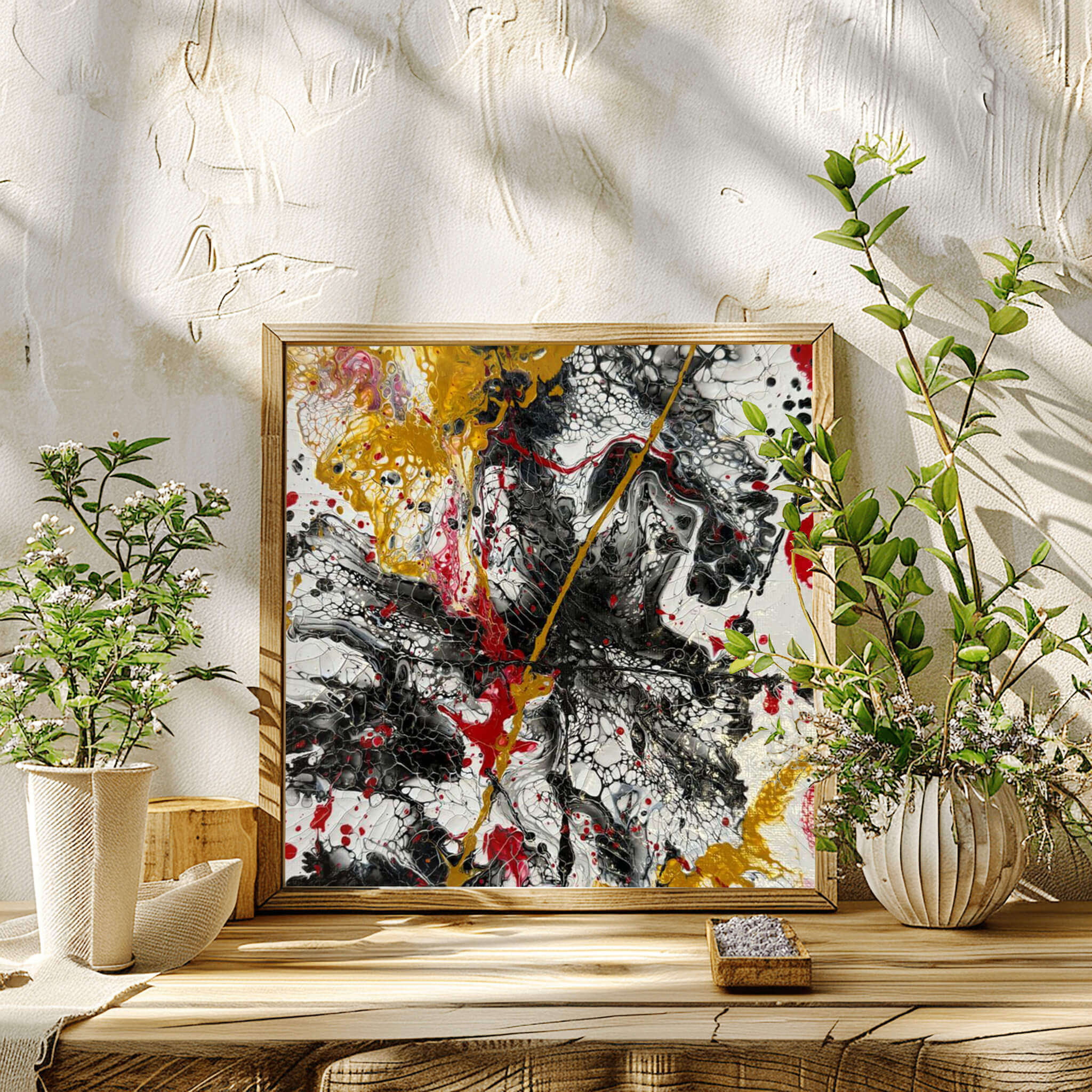 New Year’s Day captures the raw energy of beginnings, where contrast and motion collide in a moment of release. Bold fields of black and white twist and expand across the canvas, punctuated by vivid splashes of red and streaks of molten gold. The layered cells and flowing lines create a sense of movement that feels both spontaneous and intentional, as if emotion itself is breaking through the surface.