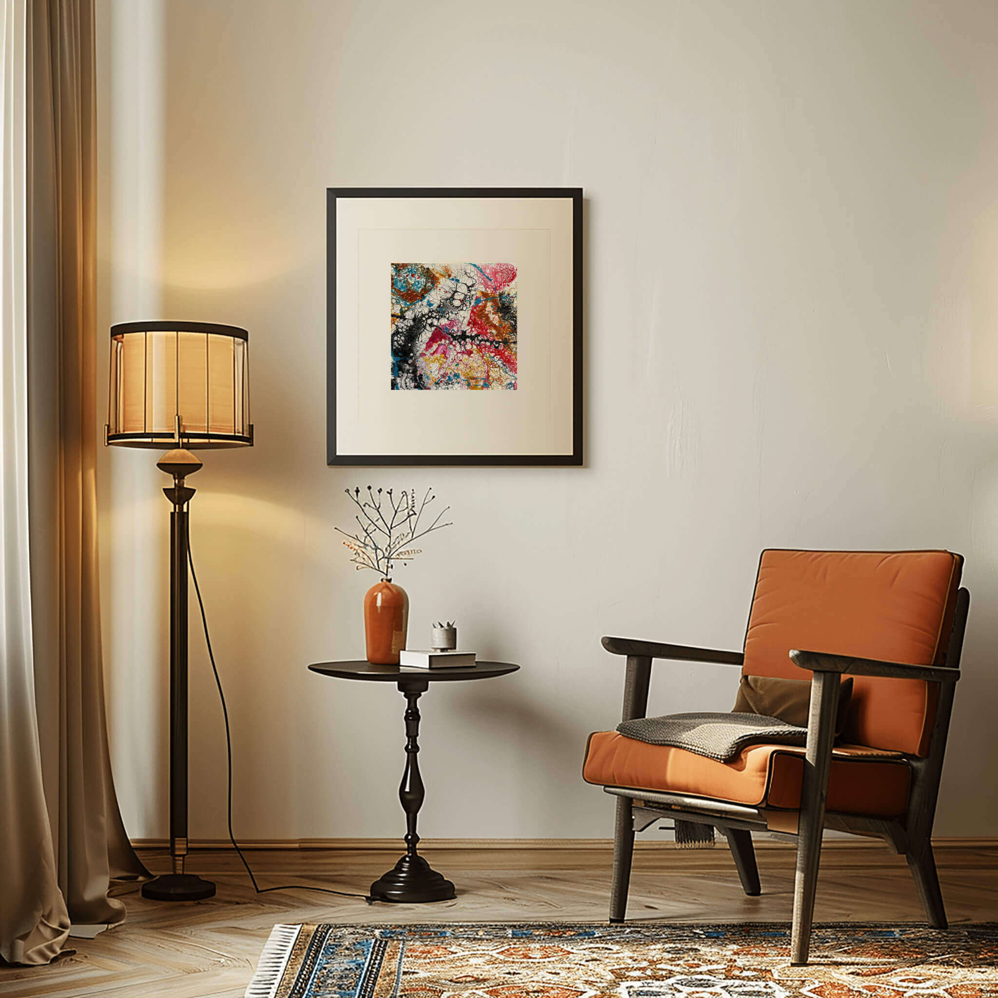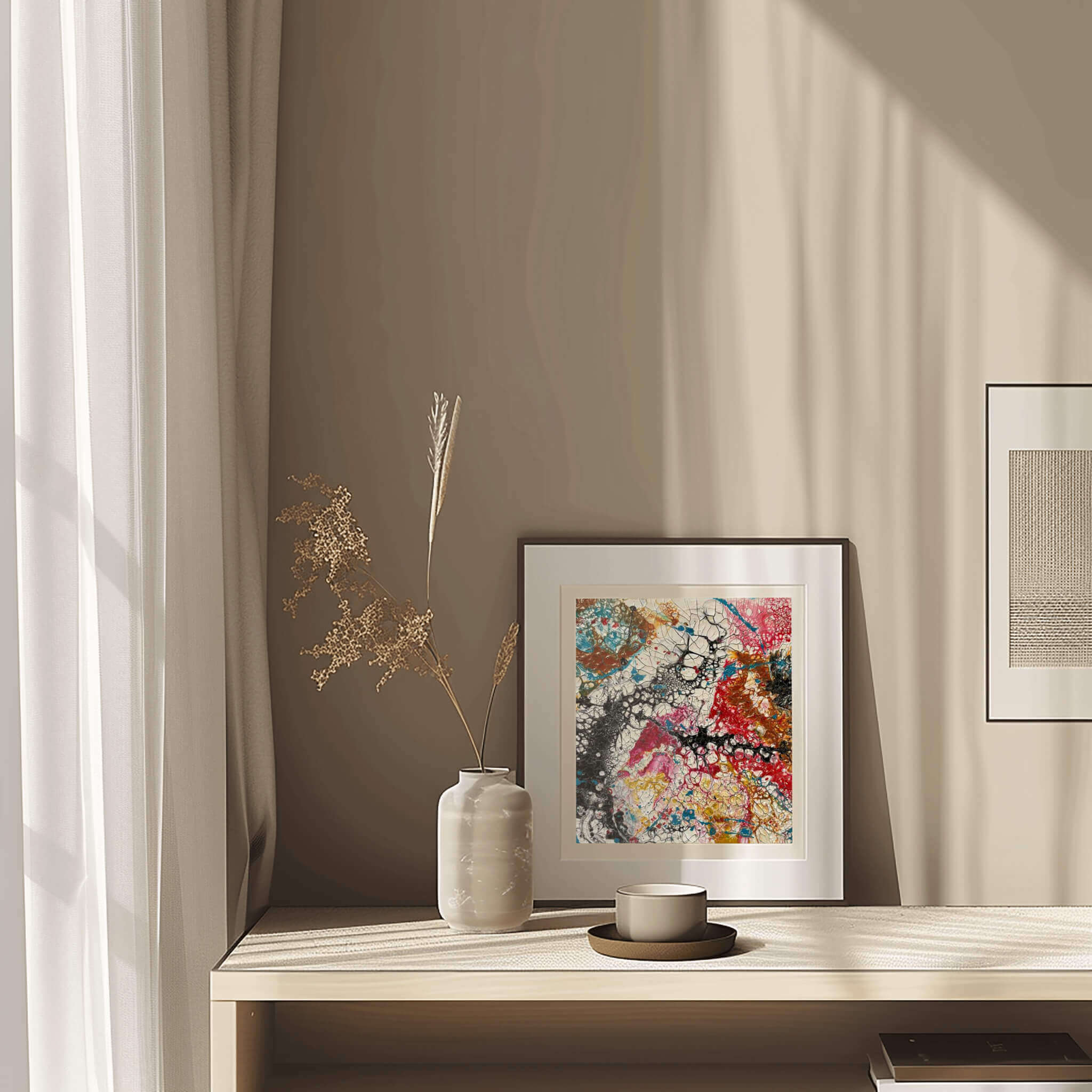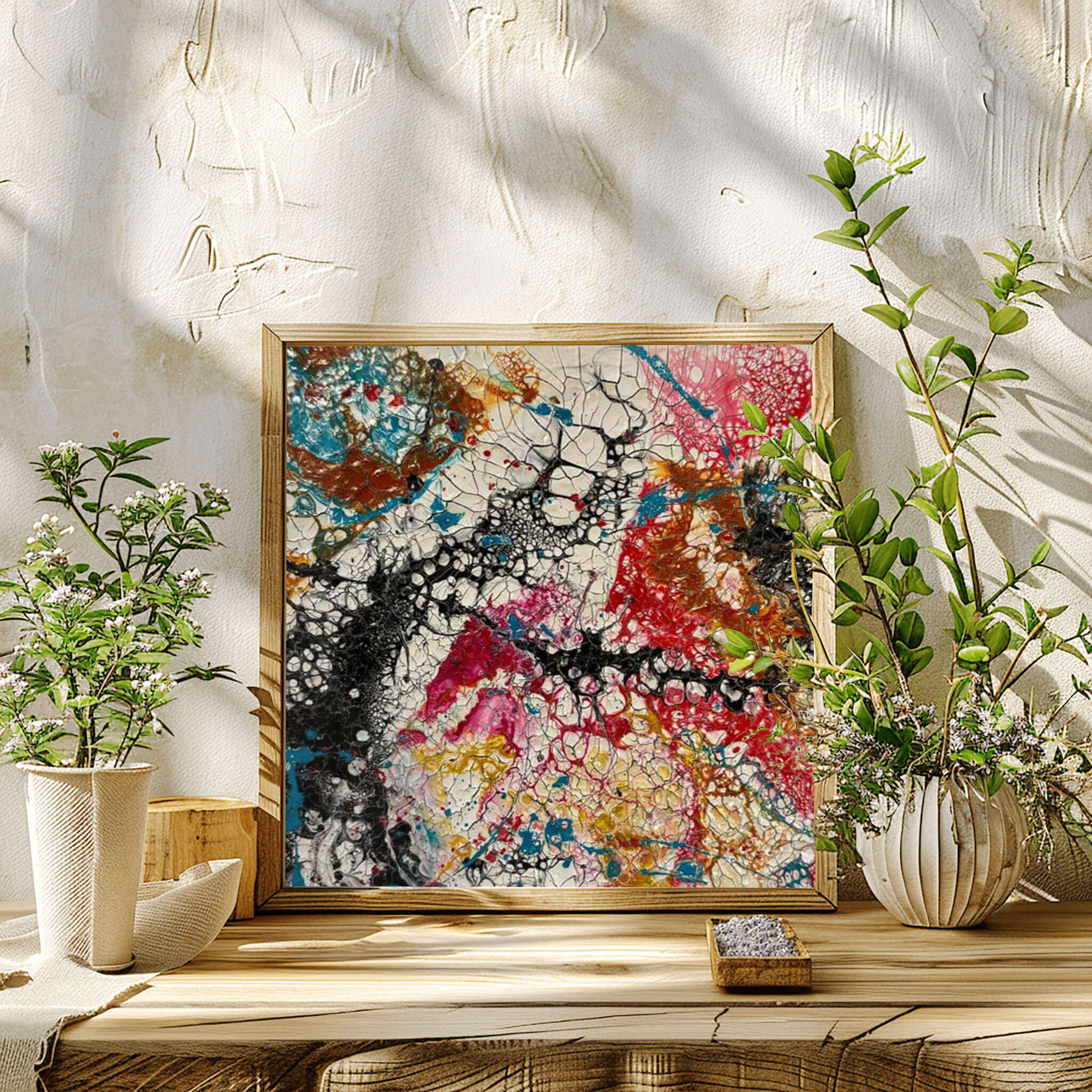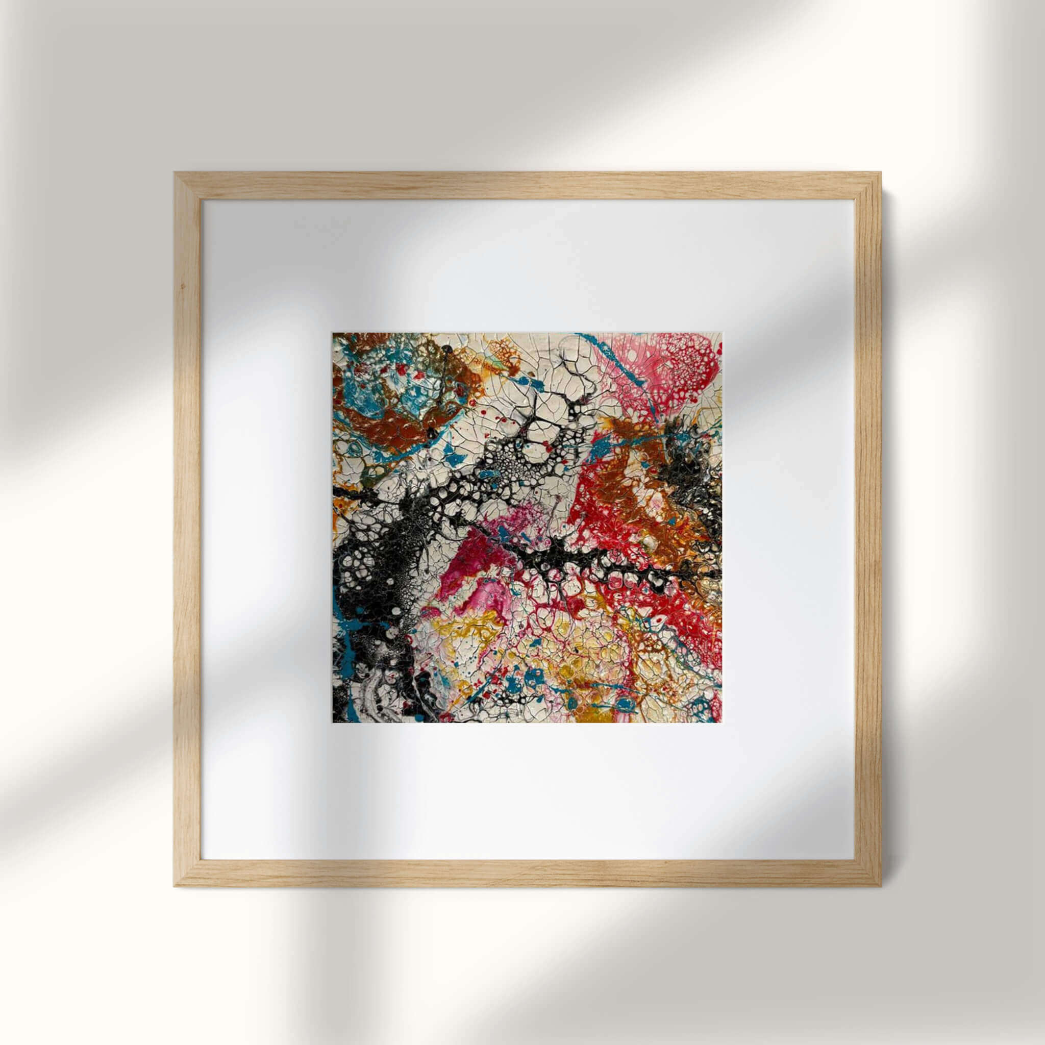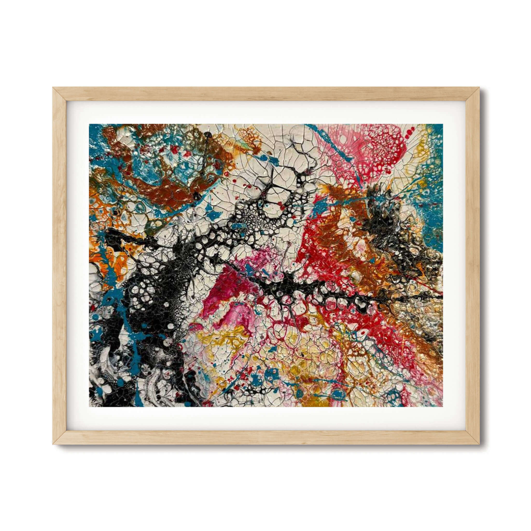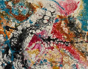 • Abstract acrylic painting with vivid streaks of crimson, amber, fuchsia, turquoise, and gold, layered in dynamic motion, evoking energy, chaos, and creative vitality.