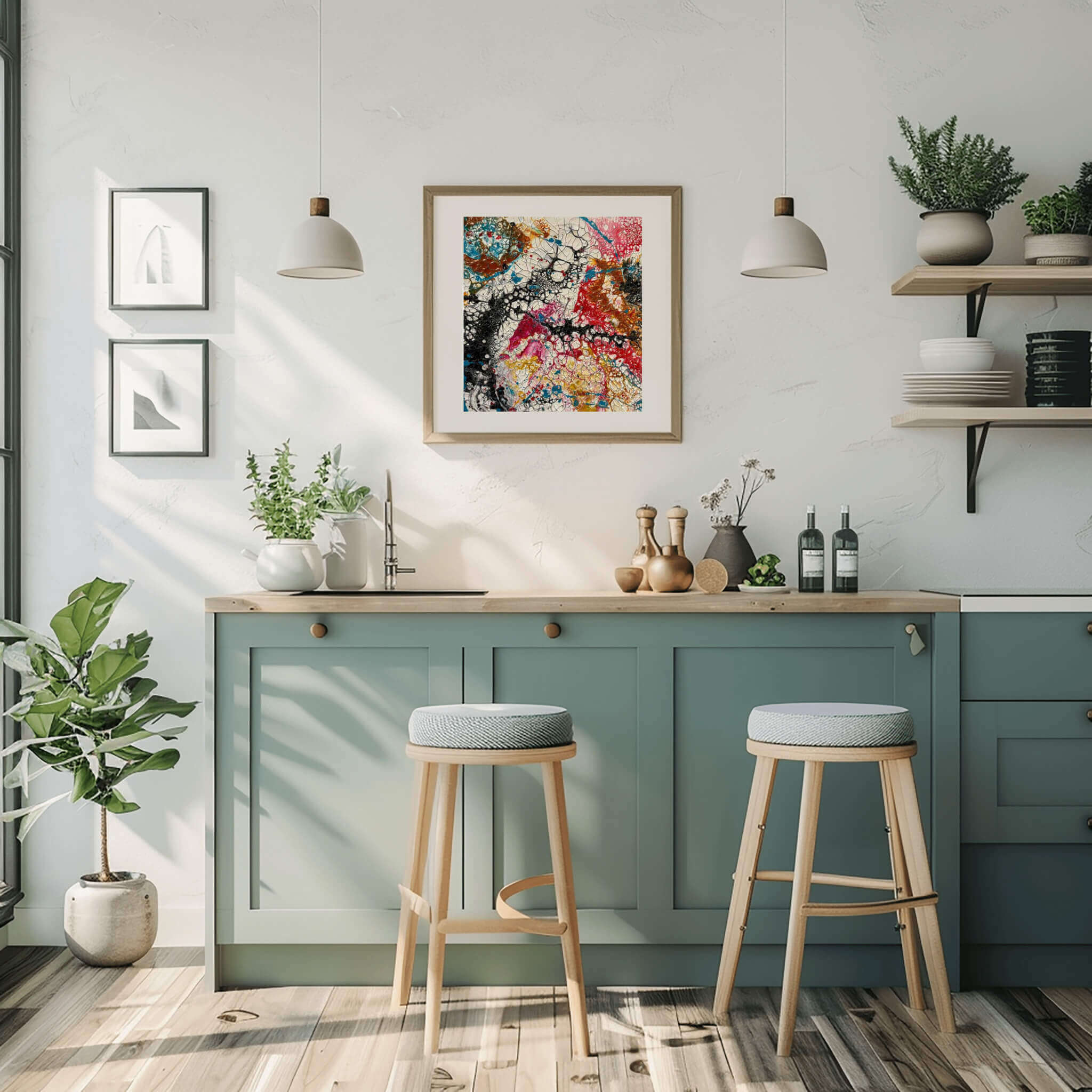 • Abstract acrylic painting with bold splashes of red, gold, lime, and tangerine on a cool aqua background, accented with metallic highlights, evoking dynamic energy and motion.
