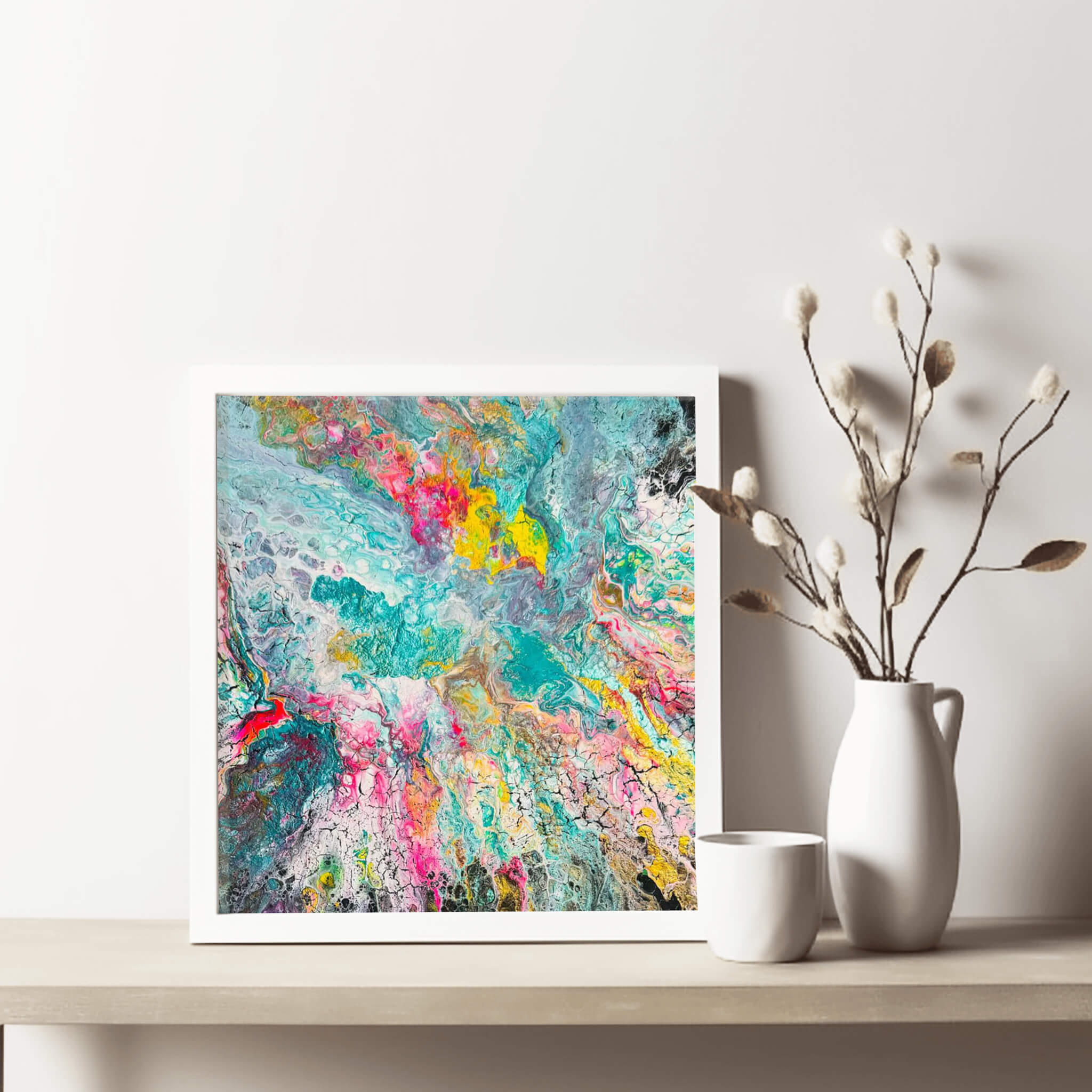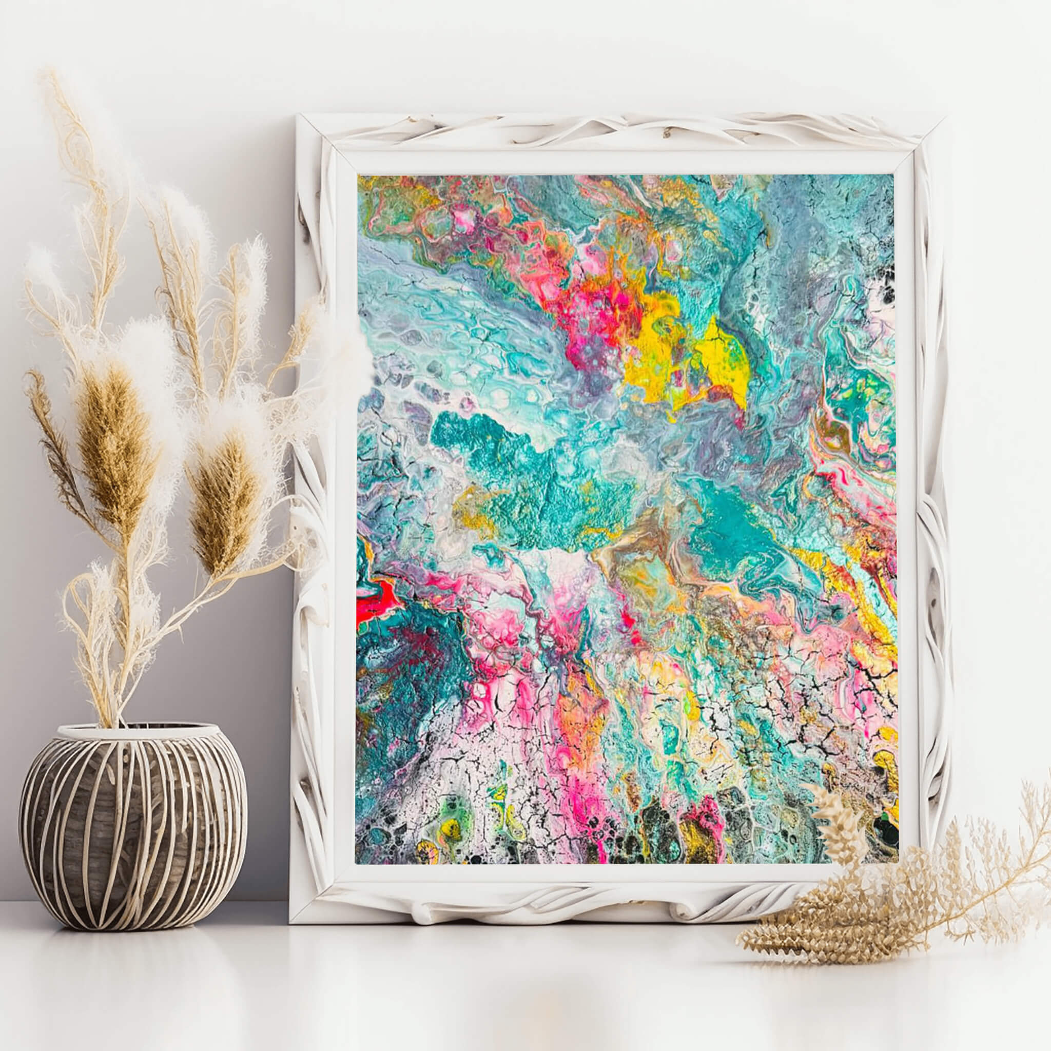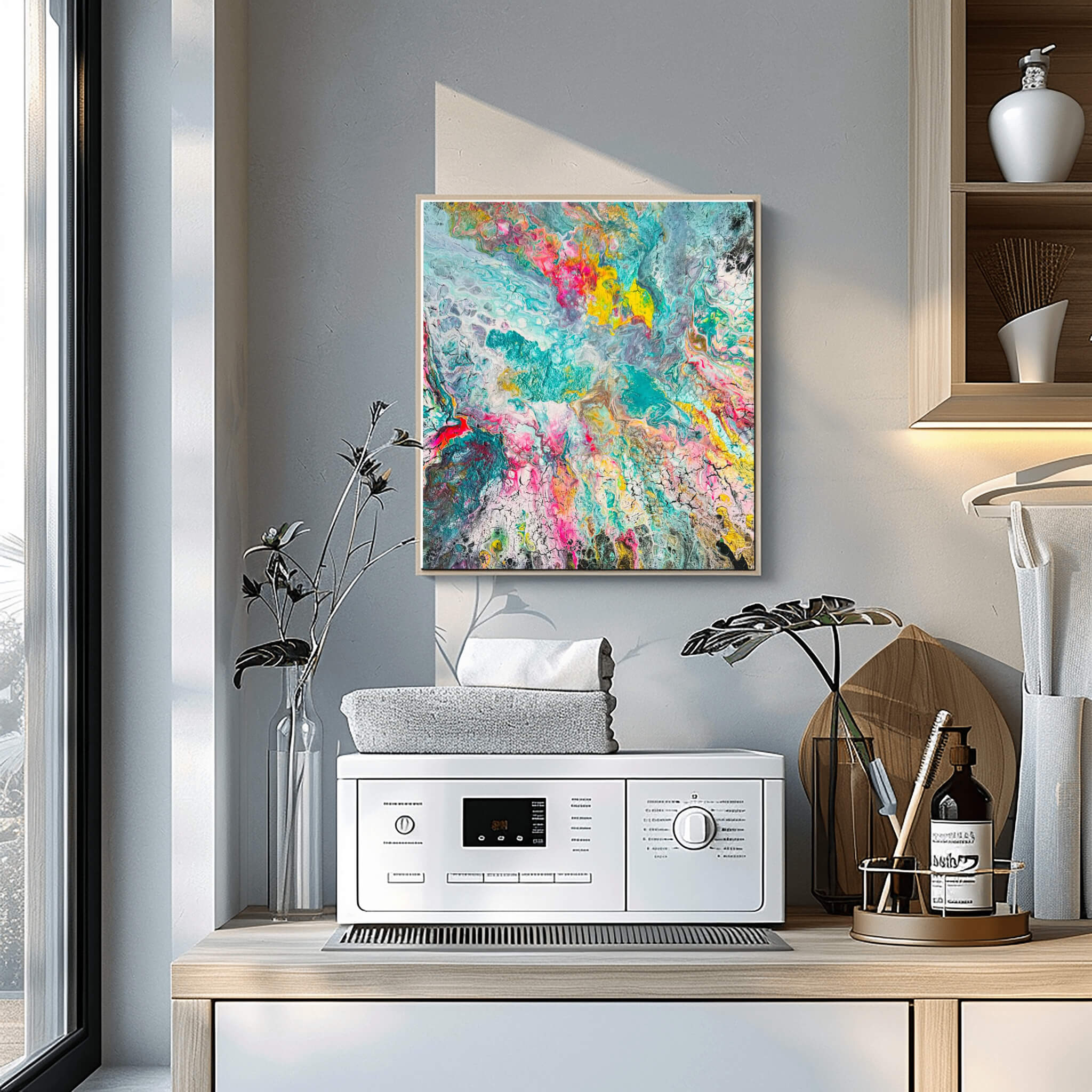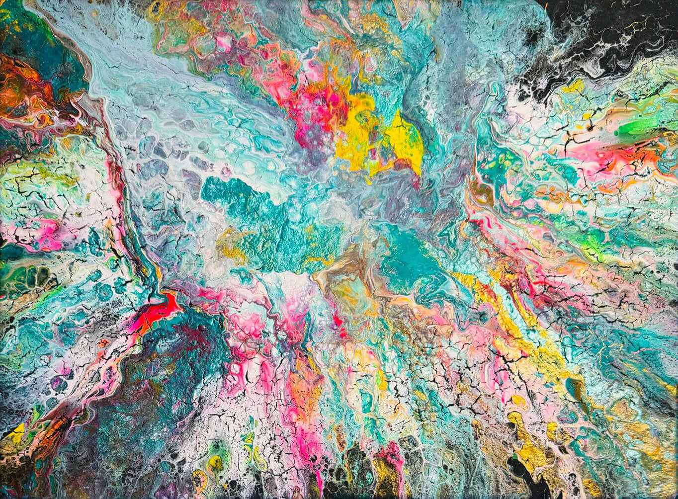 Out of the Depths captures a burst of luminous energy, where streams of turquoise, coral, and gold expand in flowing harmony. The intricate layers pulse with vitality, evoking the sensation of color ascending through light. Subtle transitions between brilliance and shadow reveal an ethereal depth—like clouds parting to expose a vivid dawn.